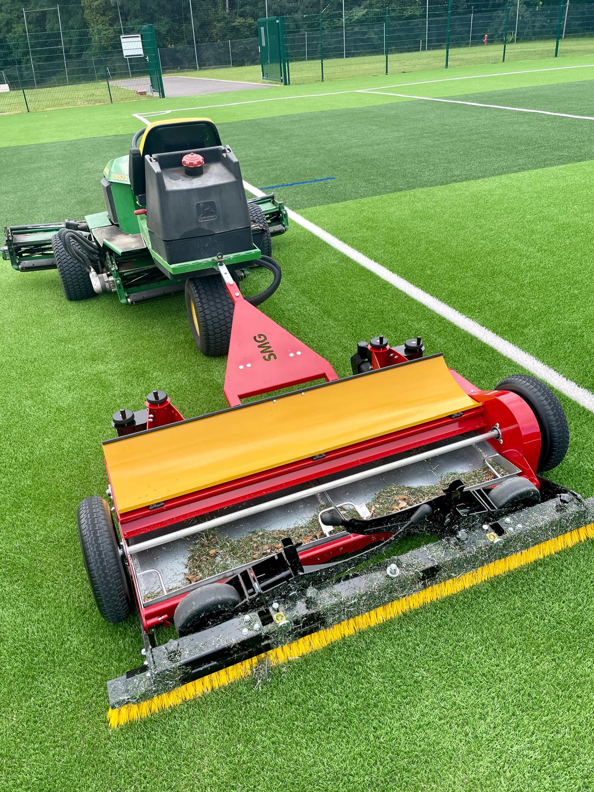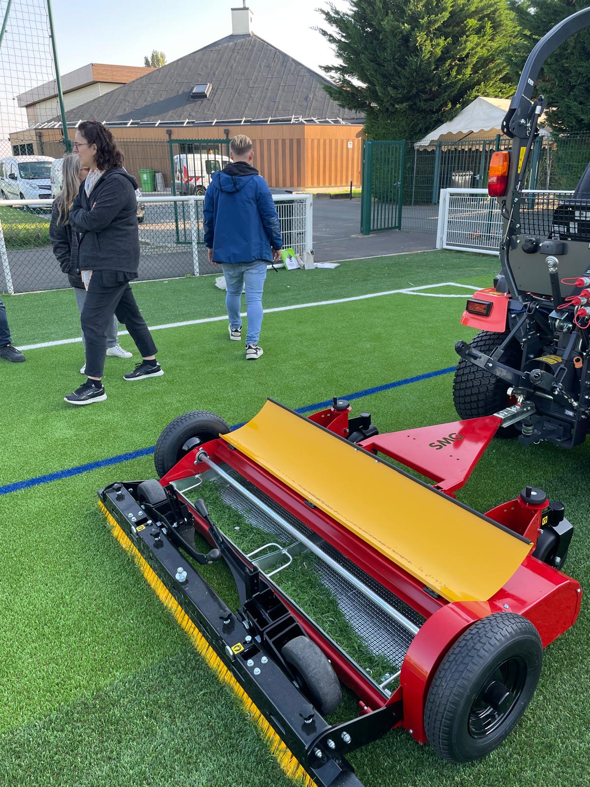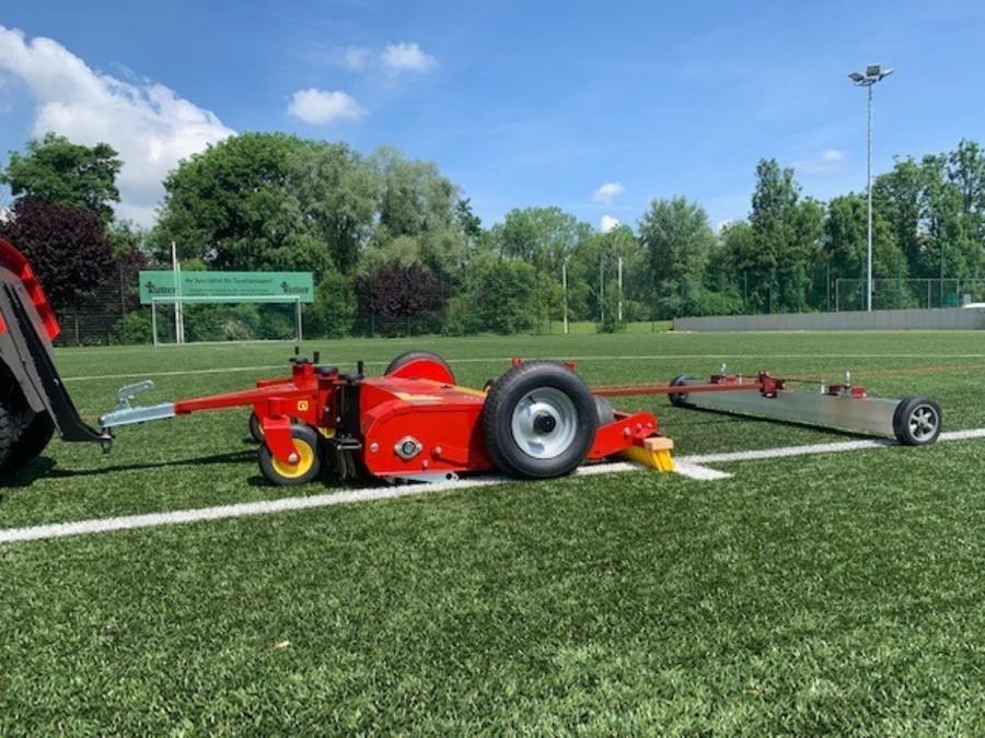 Machine auto-portée pour le décompactage et le brossage des terrains synthétiques.